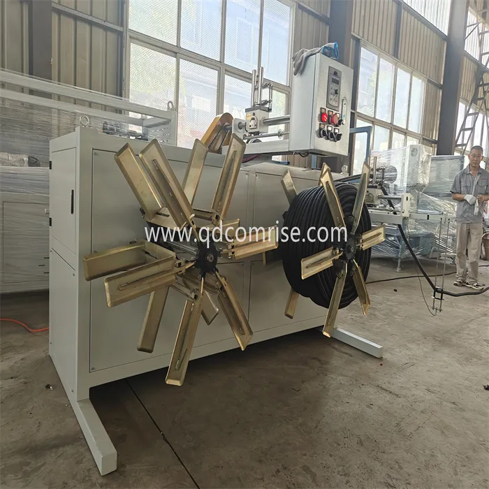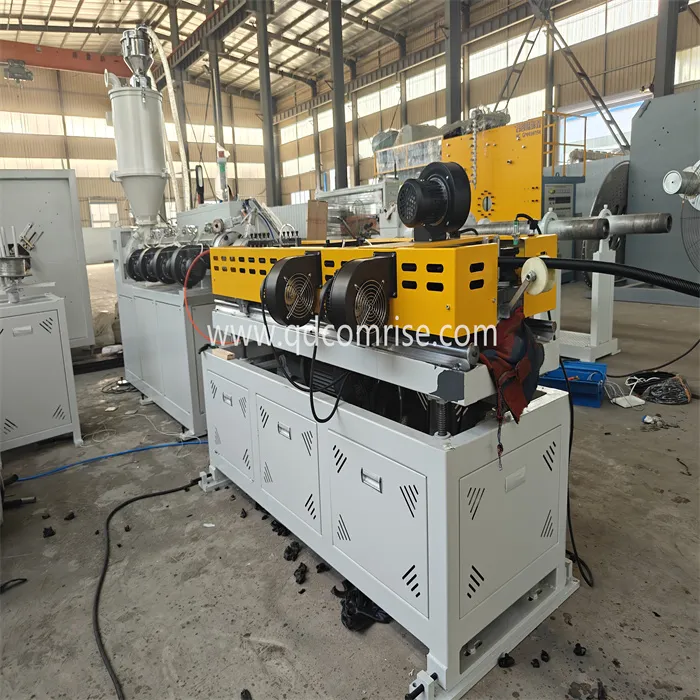 De pijp komt de golfselder binnen, waar deze wordt gevormd in een gegolfd profiel met behulp van vormblokken en vacuümdruk.